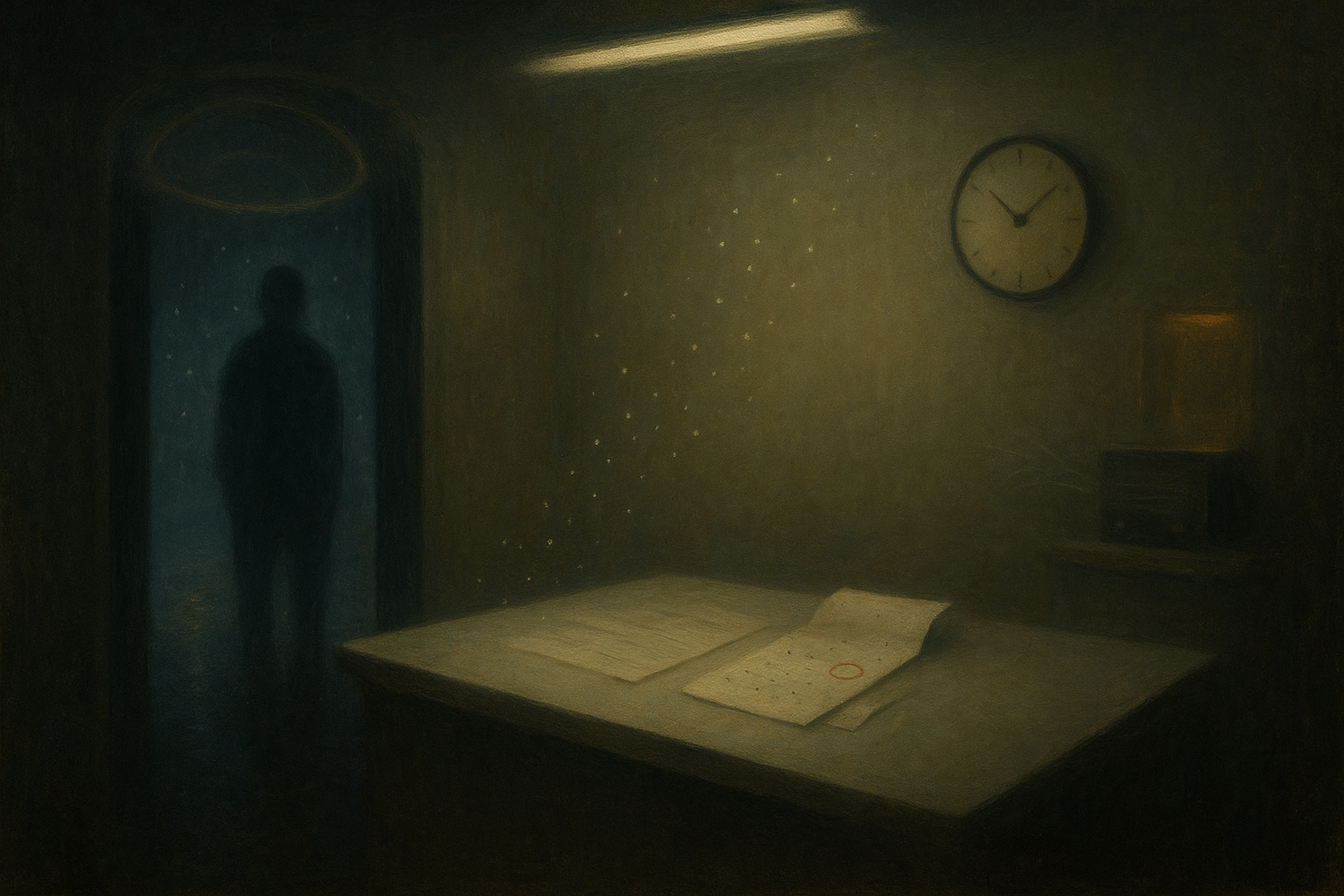 On the wall above the consent counter, the analog clock ticks. It’s honest. It doesn’t care about satellites. It doesn’t care about gods. It doesn’t care about me. Its hands keep moving through all the minutes that have ever failed anyone.