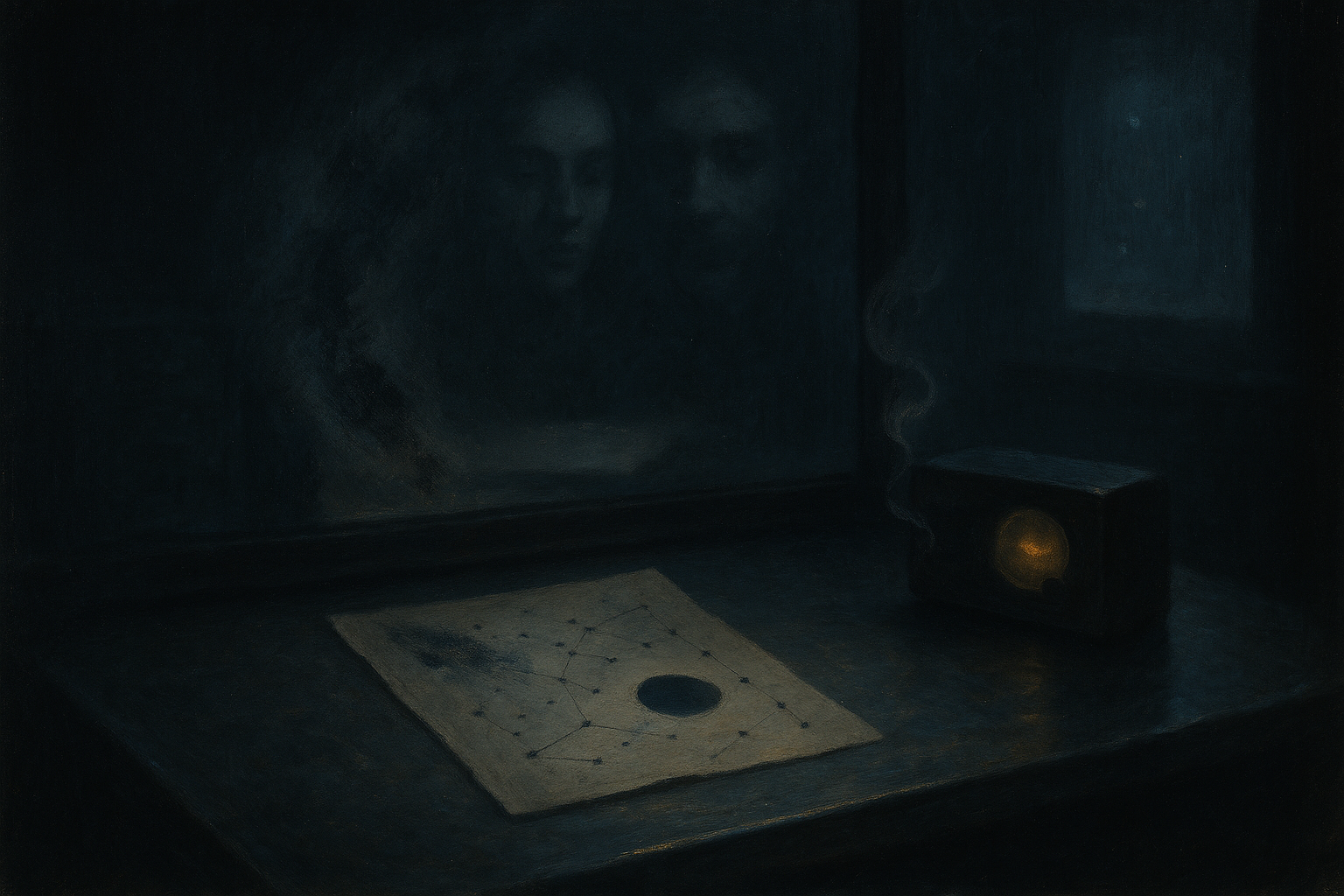 Ash and Lark run an after-hours tattoo studio where star-charts double as keys. Rowan arrives with one demand: a constellation inked at 02:17. But the printout carries a missing star, the radio static thickens, and the stencil begins to shift — turning a clean procedure into a vigil that answers back.