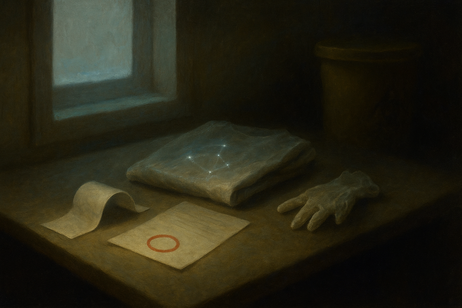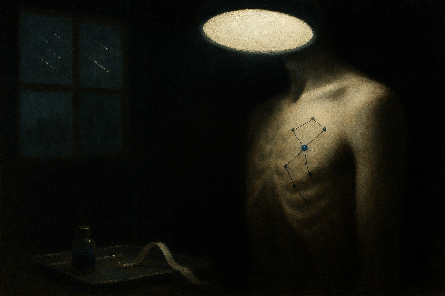 I finish the last line. I wipe the skin clean. The constellation — now also a word — glows faintly under the overhead light, a stigmata-map, a ledger, a wound that is also a guide.