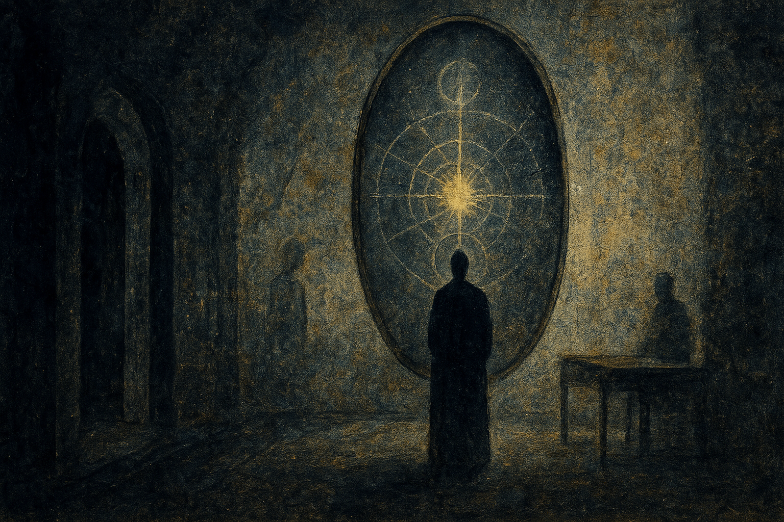 Be precise now, I told myself, because the mind, when it glimpses an aperture, immediately reaches for a catalog where a confession would be more useful; be precise, and so I named what arose: a figure, neither masculine nor feminine, walking the middle pillar within me, ascending by breaths the ladder of the rib bones into a gold that was not color but agreement, and at each rung there was a small relinquishment — an insistence left on the step like an old glove, a doctrine removed like a shoe before entering a room where a child sleeps — and the figure carried a lamp whose light was paradoxically the shadow of a flame I could not see, and in that paradox I felt a widening, as if the very act of not resolving had created a chamber large enough to house a reconciliation I had mistaken for victory.