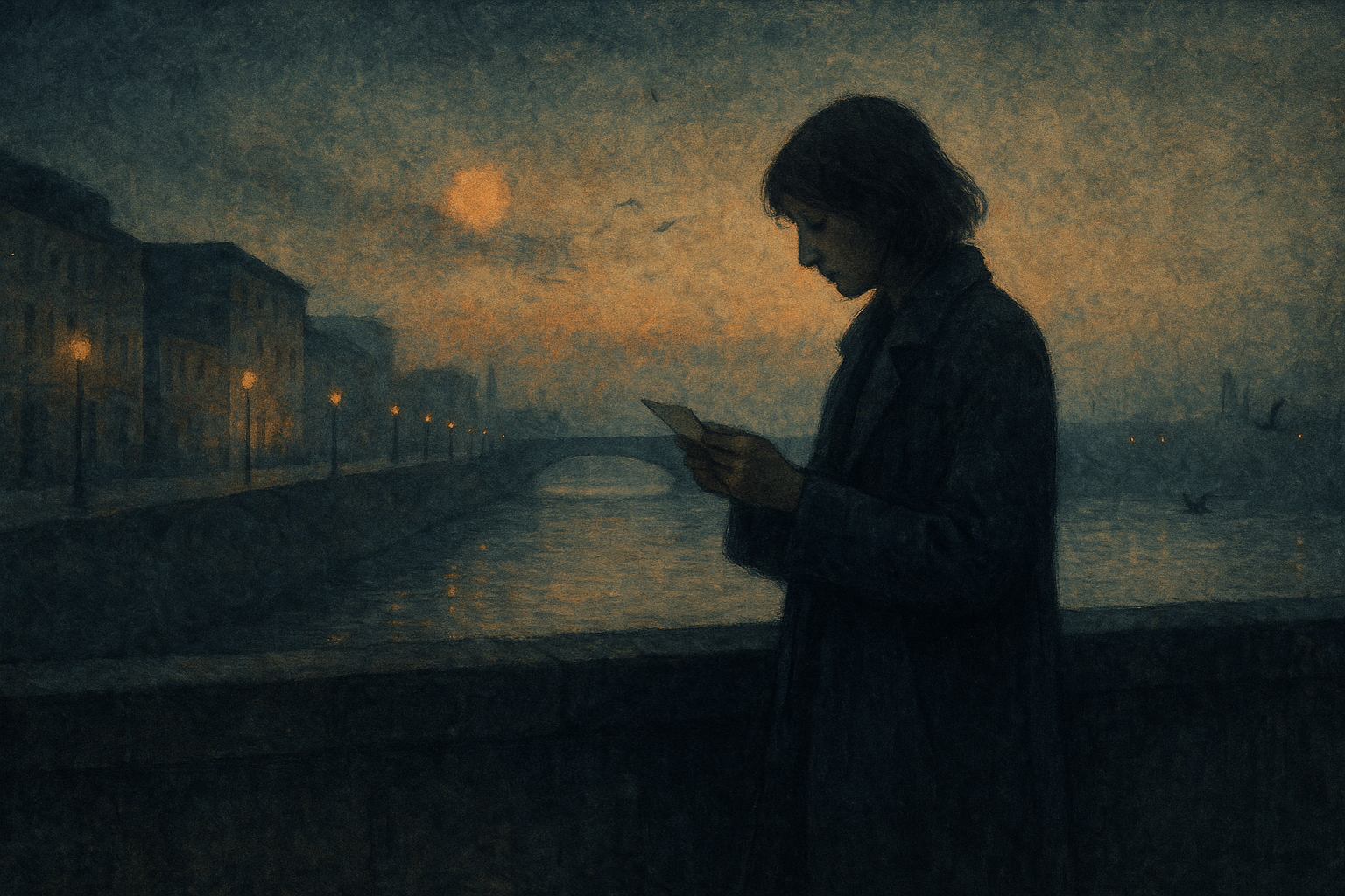 There is an image I have carried from the Institute into the metropolis: a city seen at dawn from a pedestrian bridge, the river below the color of slate and tea, a slow smear of apricot on the warehouse faces, and in the right foreground — this is important, the right foreground — a woman standing in a coat that belonged to her mother, reading a note she wrote to herself in the middle of the night and folded into her pocket, and she is crying, not dramatically but with the tears that give the eyes a lacquer, and as she reads (and as trucks downshift on the far bank and gulls pick at plastic) she breathes a breath so precise, so unadorned, that if you were close enough you would see the world, which is always listening for competent worship, rearrange itself a hair in gratitude; that is the whole of it, or the part of it I am able honestly to convey.