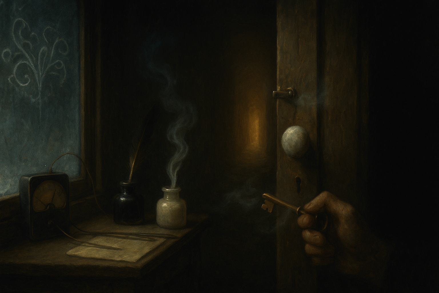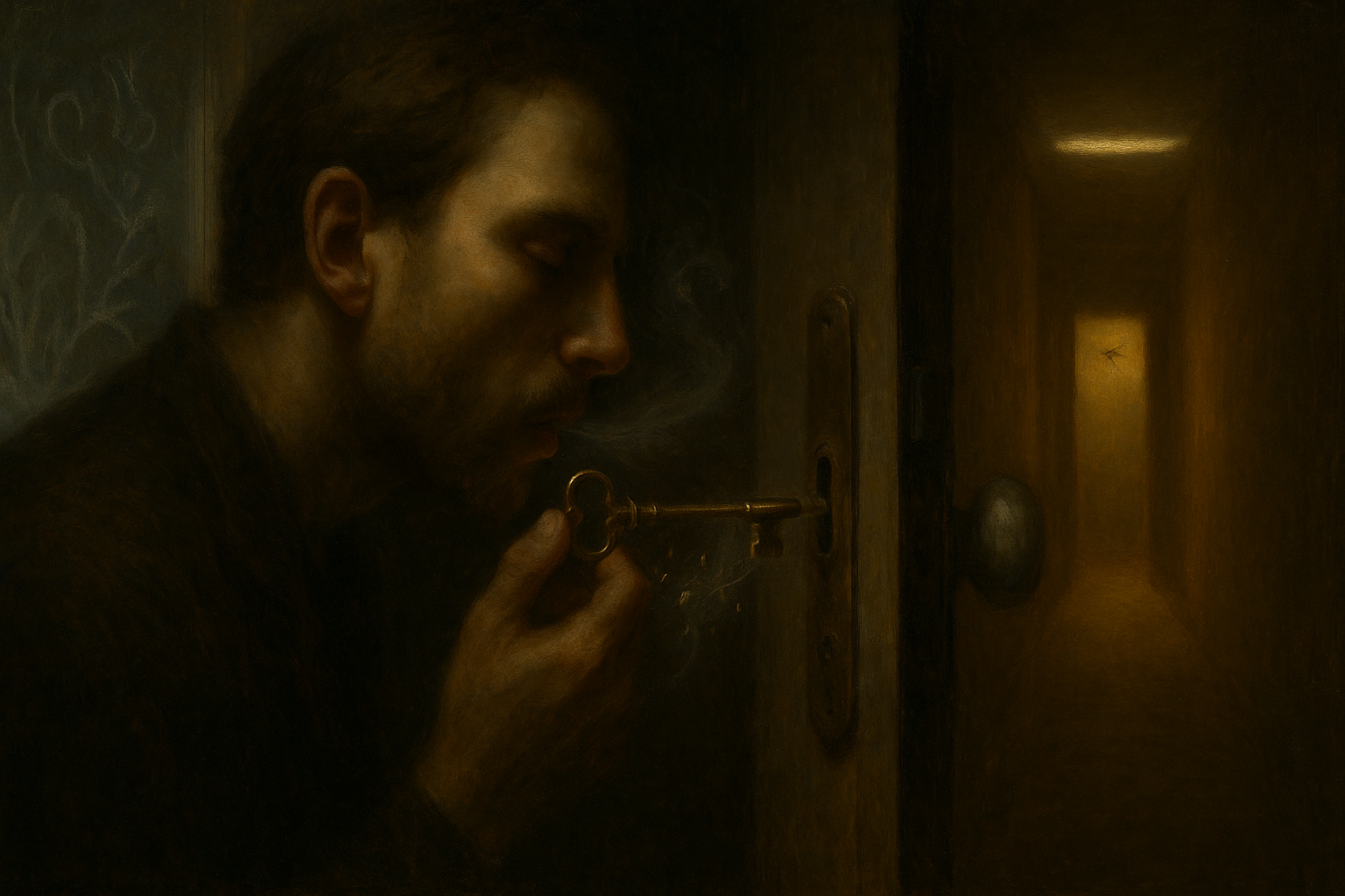 First frost writes thin Enochian across the cheap window, its letters a saccade of light-bites that you read the way a wound reads a blade: not for meaning, but for memory; your breath incense-smokes the hall, each exhale a ghost-priest, and the cold brass key — fugitive comet, pocket reliquary, instrument of etiquette and rupture — presses a lunar ache into your palm while, somewhere past the grammar of drywall, a latch unlips and a door unclicks with the precise, obscene sweetness of a mouth learning your name for the first time again, and because you are neither brave nor careful but simply tired of living under the tyranny of coherent days, you follow the unclick into the corridor that always waits for you when you remember it exists, and you find it as before: utility light gone sacral, fluorescent stutter smoothed into a chasuble glow, plaster with the sweet, stale breath of old vellum, and a whitened doorknob blooming with rime as if winter had a gland and the gland chose this single object as its nipple, and you think this is ridiculous, you think this is precise, you think this is impossible but of course, and with the feral etiquette of the initiated who always arrive late to their own rite, you bring the key to your mouth and taste the dull bright of brass — clinic and chapel coiled in a single ion — then lower it, then raise it, then lower it again, rehearsing inevitability, because you learned young that repetition is how you teach the body to trust the future.