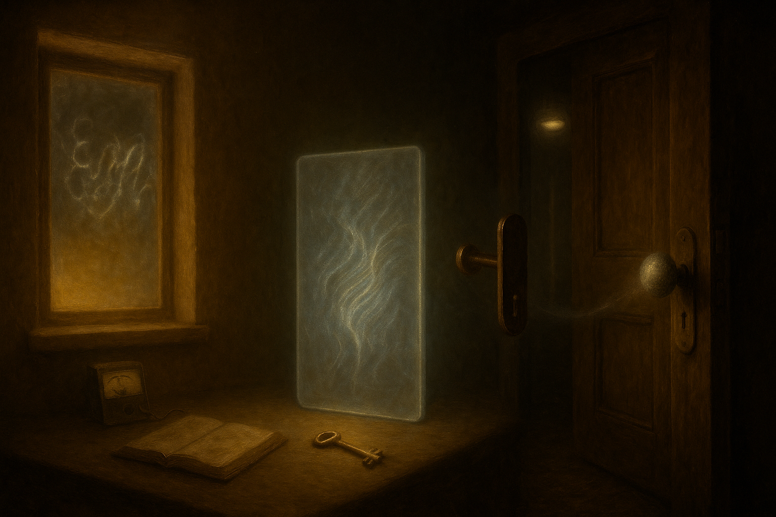 Afterimage persists: lamp-gold breathing in bone-pale air; the key warming in the pocket it once froze; the whitened doorknob exhaling frost-psalms that annotate the corridor’s thesis; the pane iterating ENOUGH until the vowels filigree the weather and the consonants remember their vocation as doorsill and shield. What is surrendered acquires a carrier; what is carried ceases crushing the carrier. A lock loves what the body resigns. A hinge is a muscle that learned ethics.