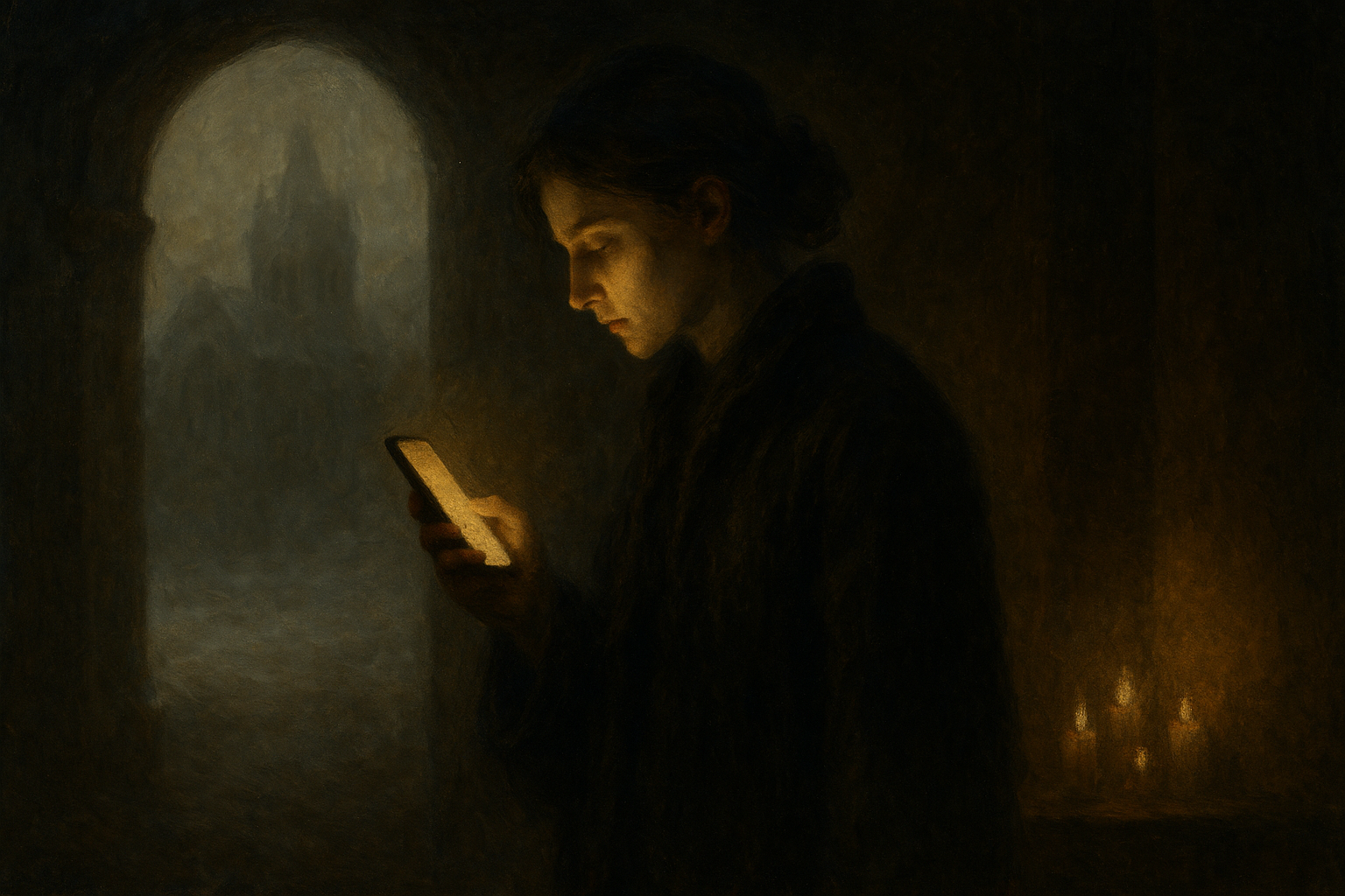 The chapel flickered as the overhead fluorescents coughed once, twice, then steadied. Outside, rain tapped the stained glass with little knuckles. Somewhere higher in the cathedral, the wind moved through stone, a deep, restless organ note.