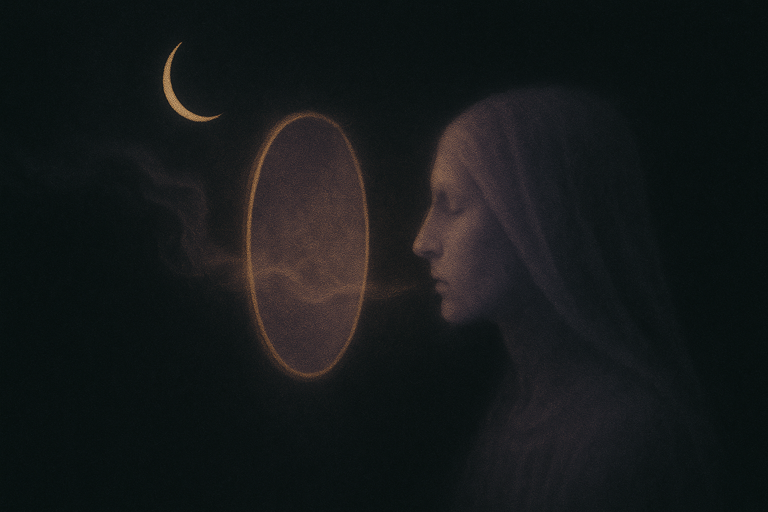 Beneath a knife-moon’s hush, a scriptorium waits — veils shifting, brass glowing faintly, silence bending toward song. A breath withheld, a breath returned, and the page begins to write itself.
